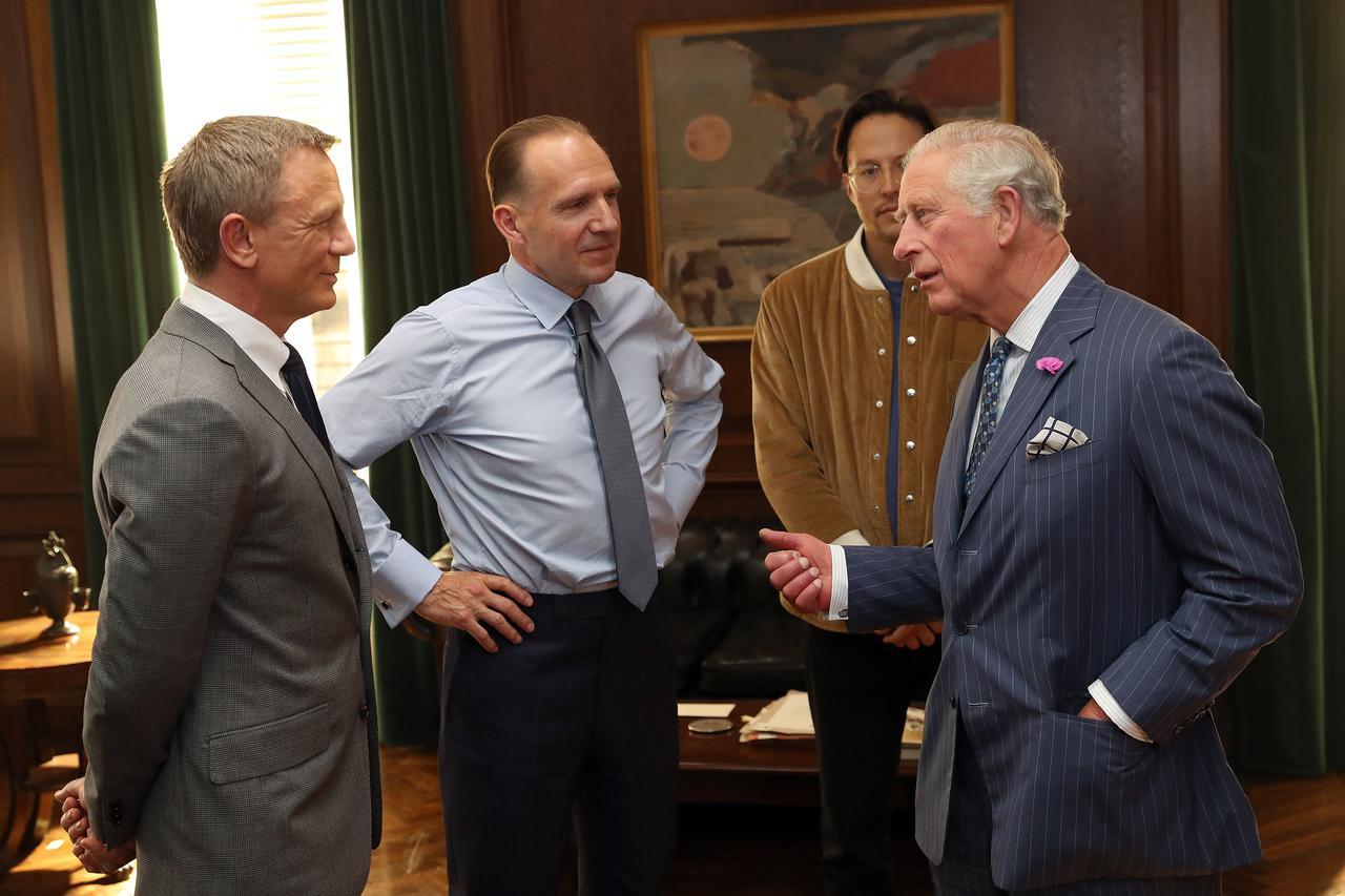 右からチャールズ皇太子、『BOND 25』監督のキャリー・フクナガ、出演者のレイフ・ファインズ、ダニエル・クレイグ。