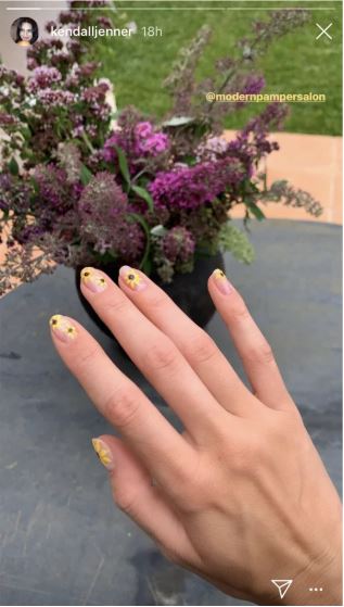 モデルのケンダル・ジェンナーは、クリアネイルをベースに黄色のヒマワリの「フラワー・ネイル」。