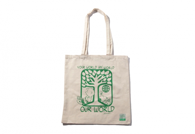 程よい厚みのあるオーガニックコットンを使用したトートバッグには、「YOUR WORLD MY WORLD OUR WORLD」という環境保護への想いを込めたメッセージとともに大きな木の下に寝転ぶスヌーピーたちが描かれている。