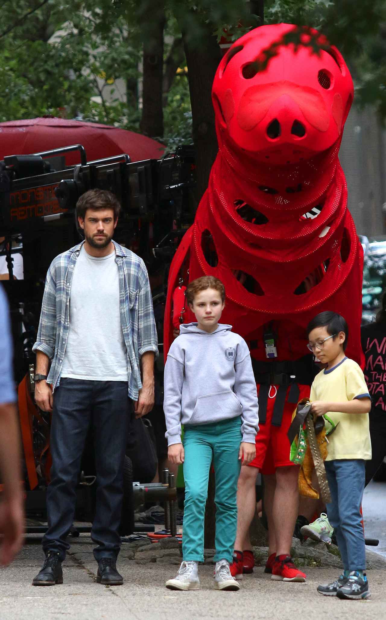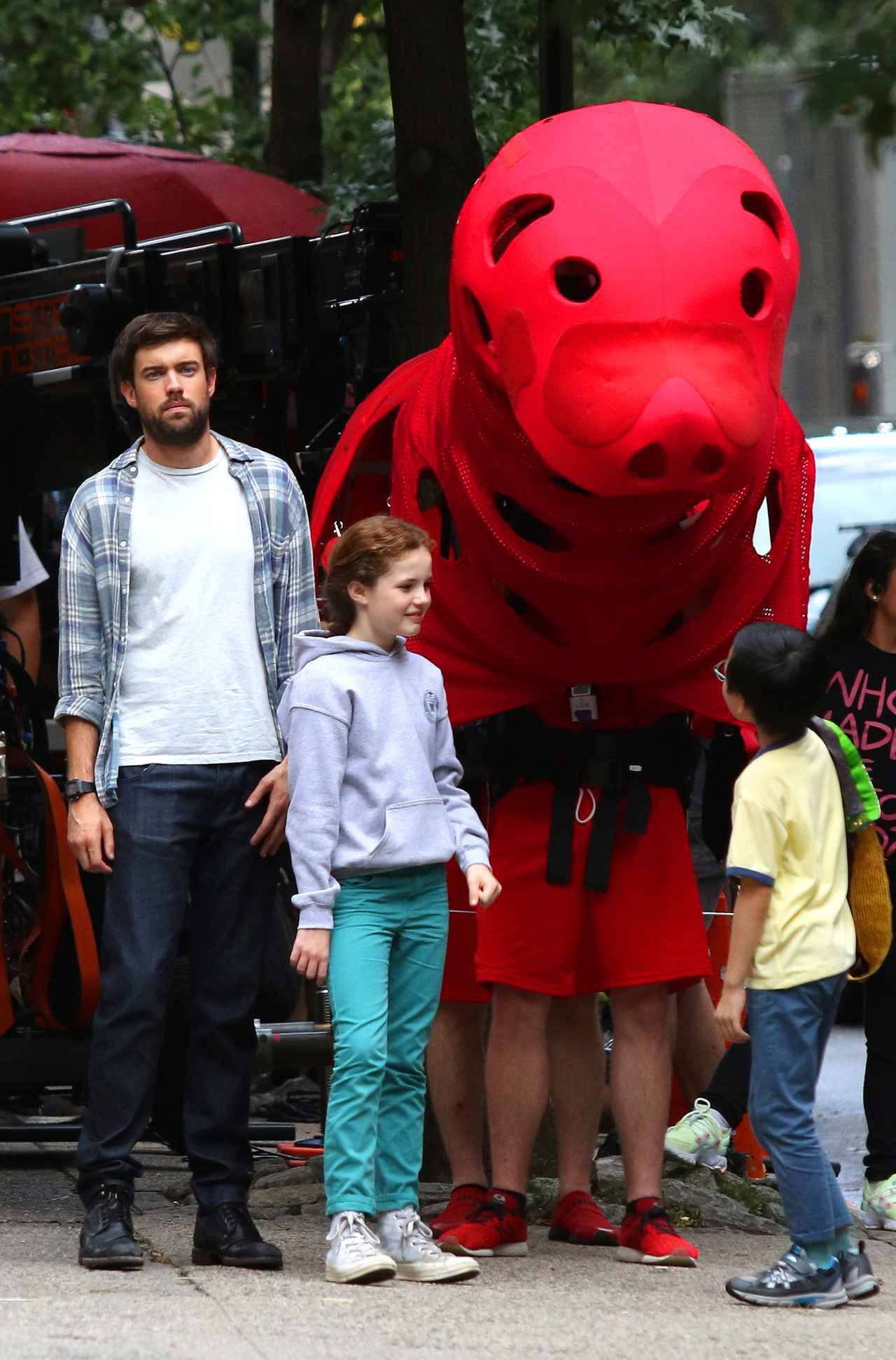 今回の撮影では、赤い大きな犬のクリフォードの姿が。クリフォードは身長185センチと言われているコメディアンのジャック・ホワイトホールが隣に並んでもかなり大きいのが一目瞭然。