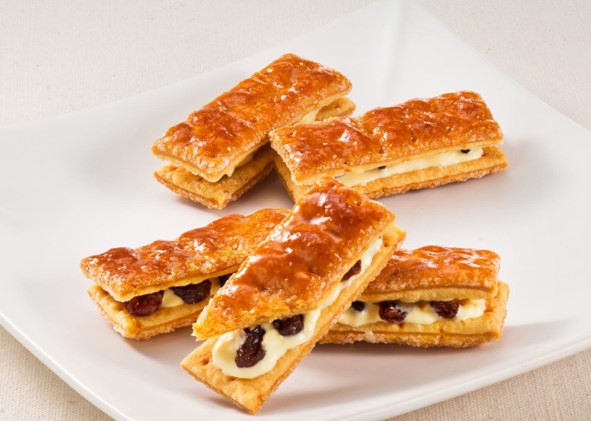 カマンベールチーズとホワイトチョコレートのクリームを混ぜ込みミルフィーユでサンド。ミルフィーユはバターをたっぷり練り込んだ生地を、576層に折り重ねさっくさくに焼き上げている。