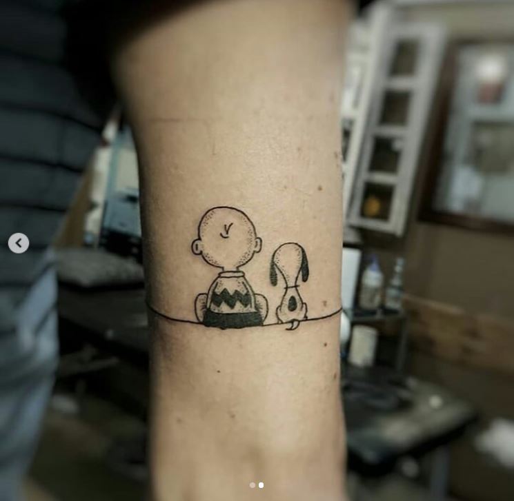 二の腕に、スヌーピーと、飼い主で漫画の主人公であるチャーリー・ブラウンの2ショット。漫画の一コマのような後ろ姿がかわいい。モノトーンのペンタッチで描かれている。
