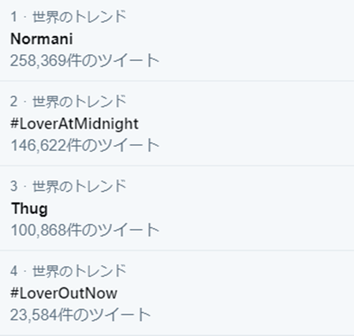 しかし、ふたを開けてみれば、ノーマニ(Normani)の名前がツイッターの世界トレンドでダントツ1位。2位のテイラーの新曲に関連する「#LoverAtMidnight」というハッシュタグよりも多いツイート数でノーマニの話題が拡散されている。