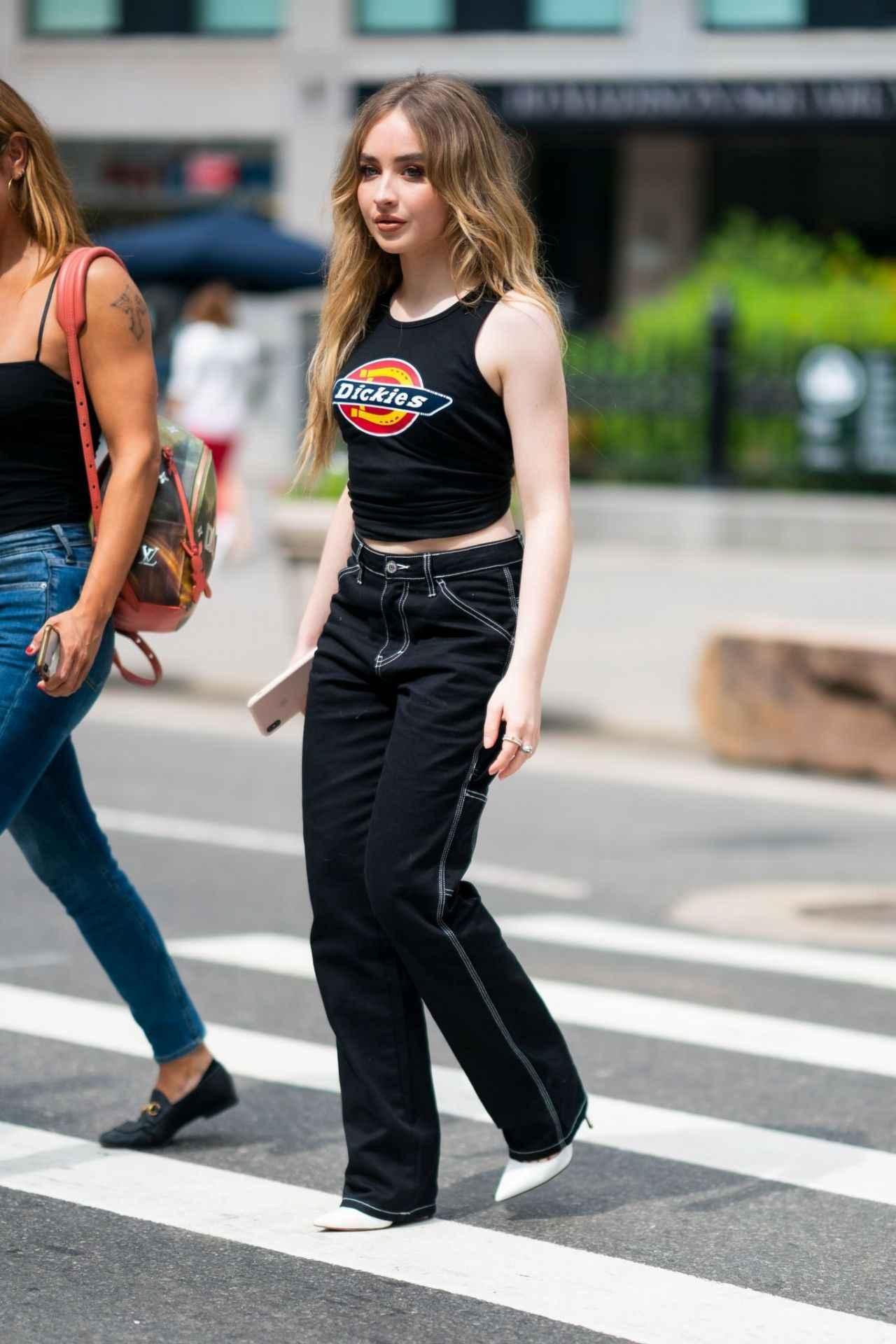 人気シンガーのサブリナ・カーペンターは、カジュアルブランドDickies(ディッキーズ)のタンクトップを、コンパクトに後ろで結んで、少しワイドなラインのバギーデニムを合わせたヒップなコーデ。ホワイトのポインテッドヒールで、クールなスパイスを効かせて。