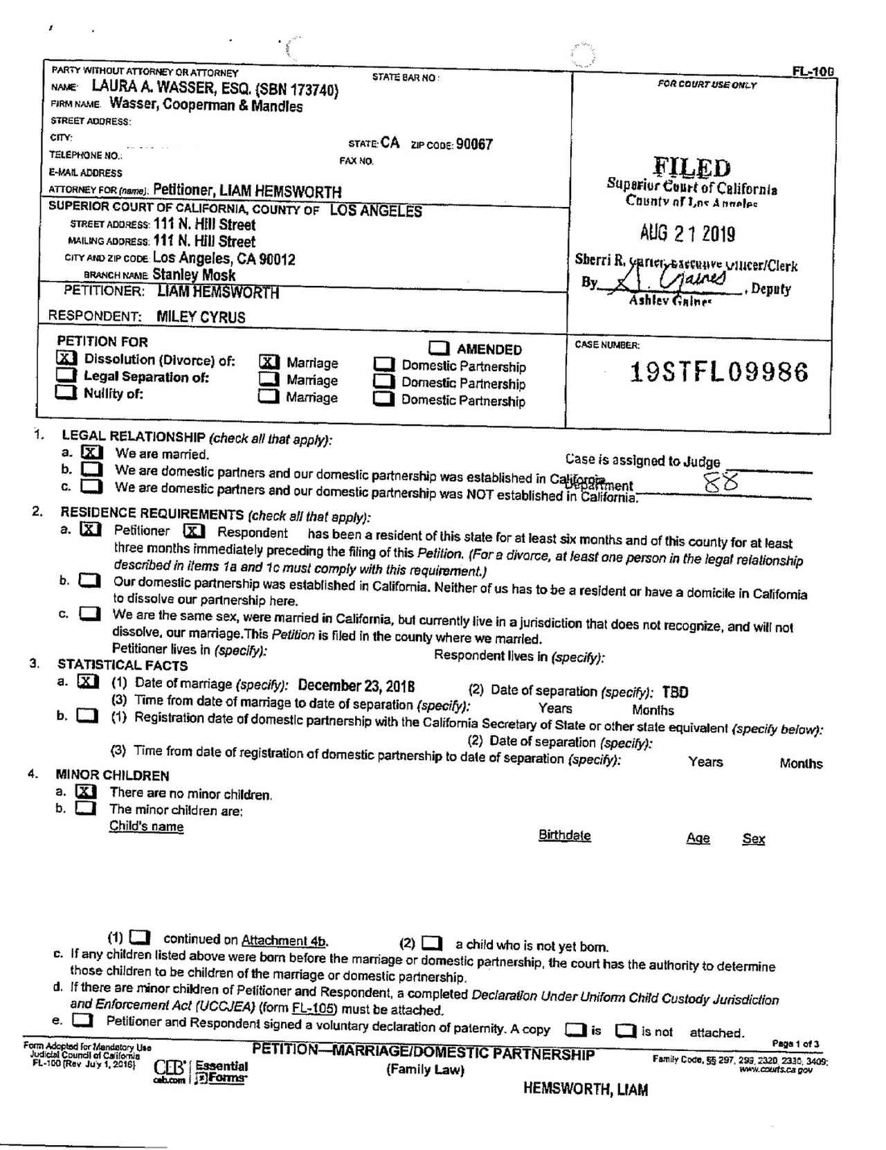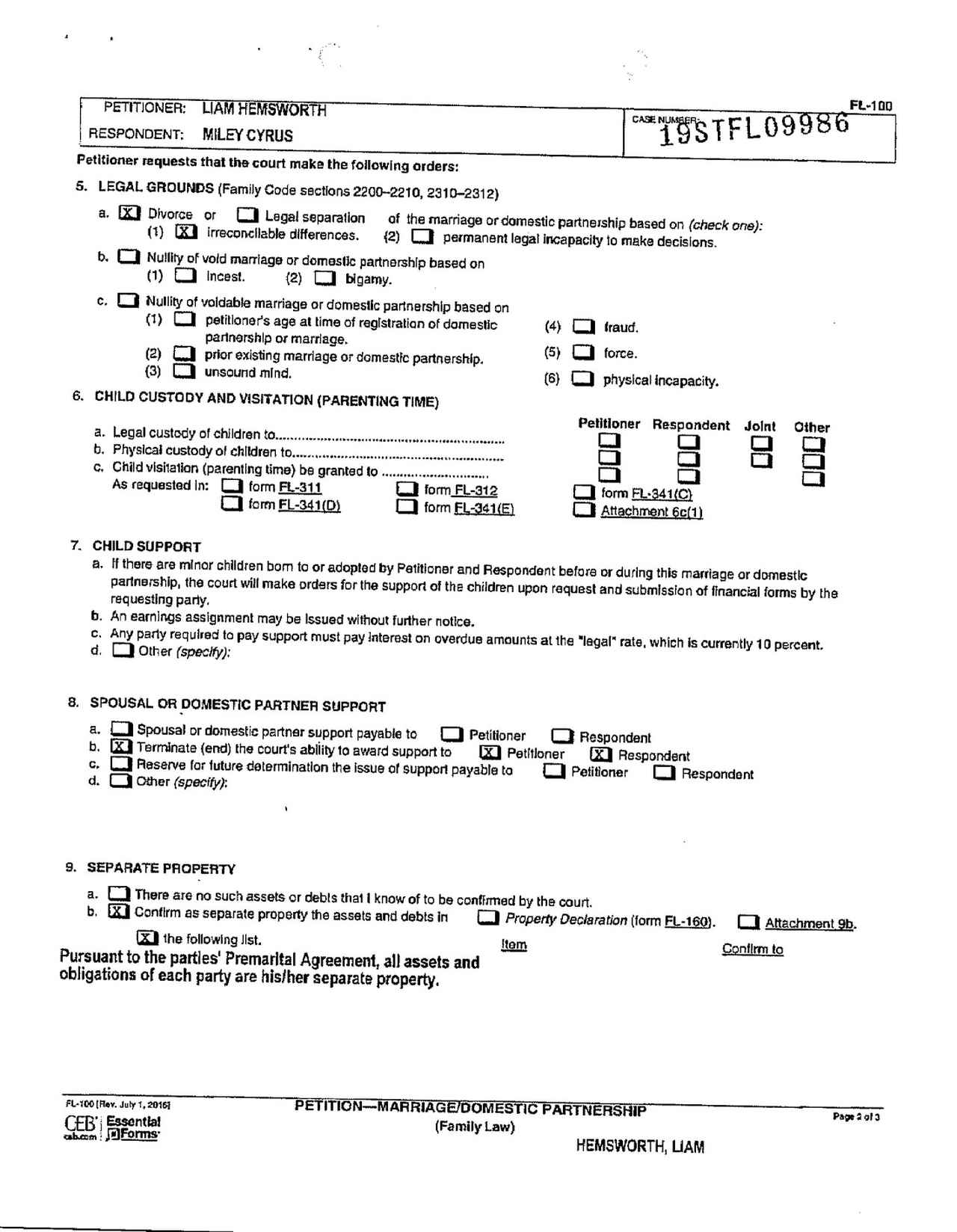 現地時間の8月19日付で、リアムがロサンゼルスの裁判所にマイリーとの離婚申請書類を提出。フロントロウはリアムと彼の弁護士によって署名された申請書類を入手した。