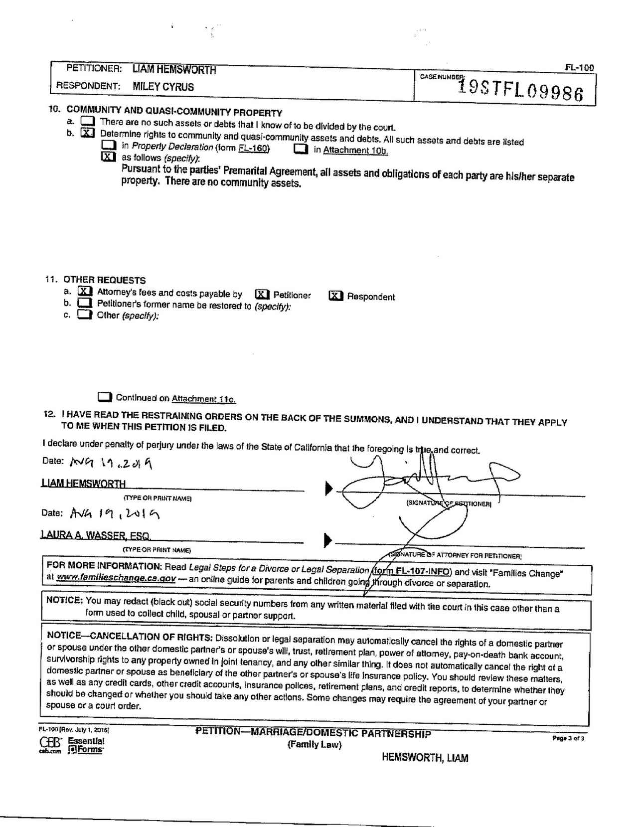 リアム側の弁護人を務めるのは、アンジェリーナ・ジョリー&ブラッド・ピットやジョニー・デップ&アンバー・ハードの離婚でも指名されたセレブ御用達敏腕弁護士のローラ・ワッサー。申請書の最後のページには、リアムの署名とともにワッサー弁護士の署名も確認できる。