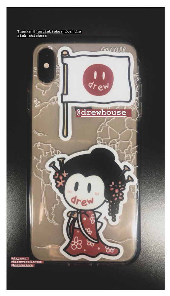 このほかにも様々なバリエーションがあるドリュー・ハウスのオリジナルステッカーは、ジャスティンのイチオシのアイテムで自分でも愛用しまくっており、ノートやパソコン、スマホのケースに貼りまくっている。