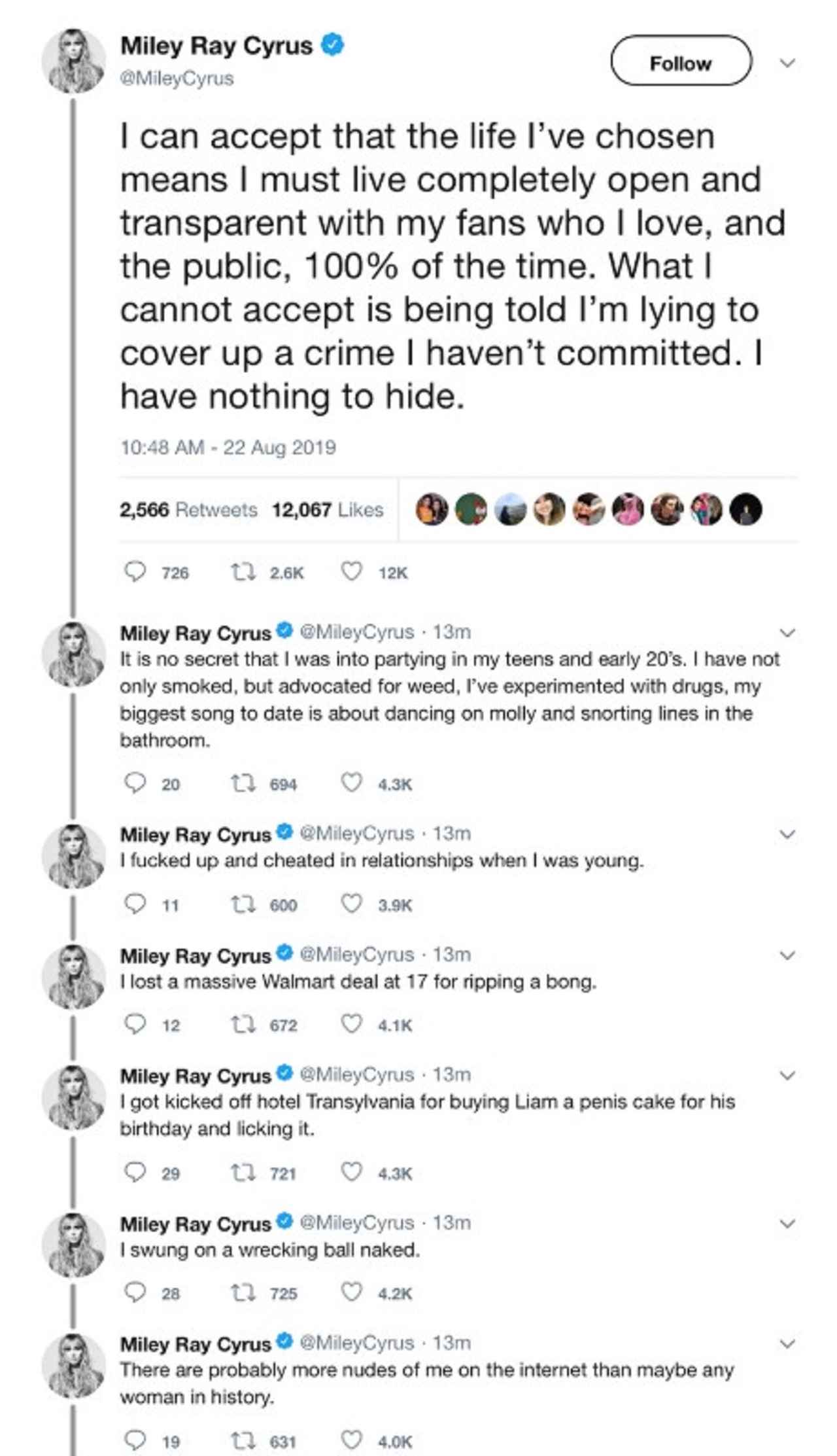 そんななか、マイリーが、世間で囁かれている、リアムとの破局原因が自身の浮気であるというウワサに真っ向から反論。10件以上におよぶツイートを連投して、自分は断固として浮気などしていないと主張した。