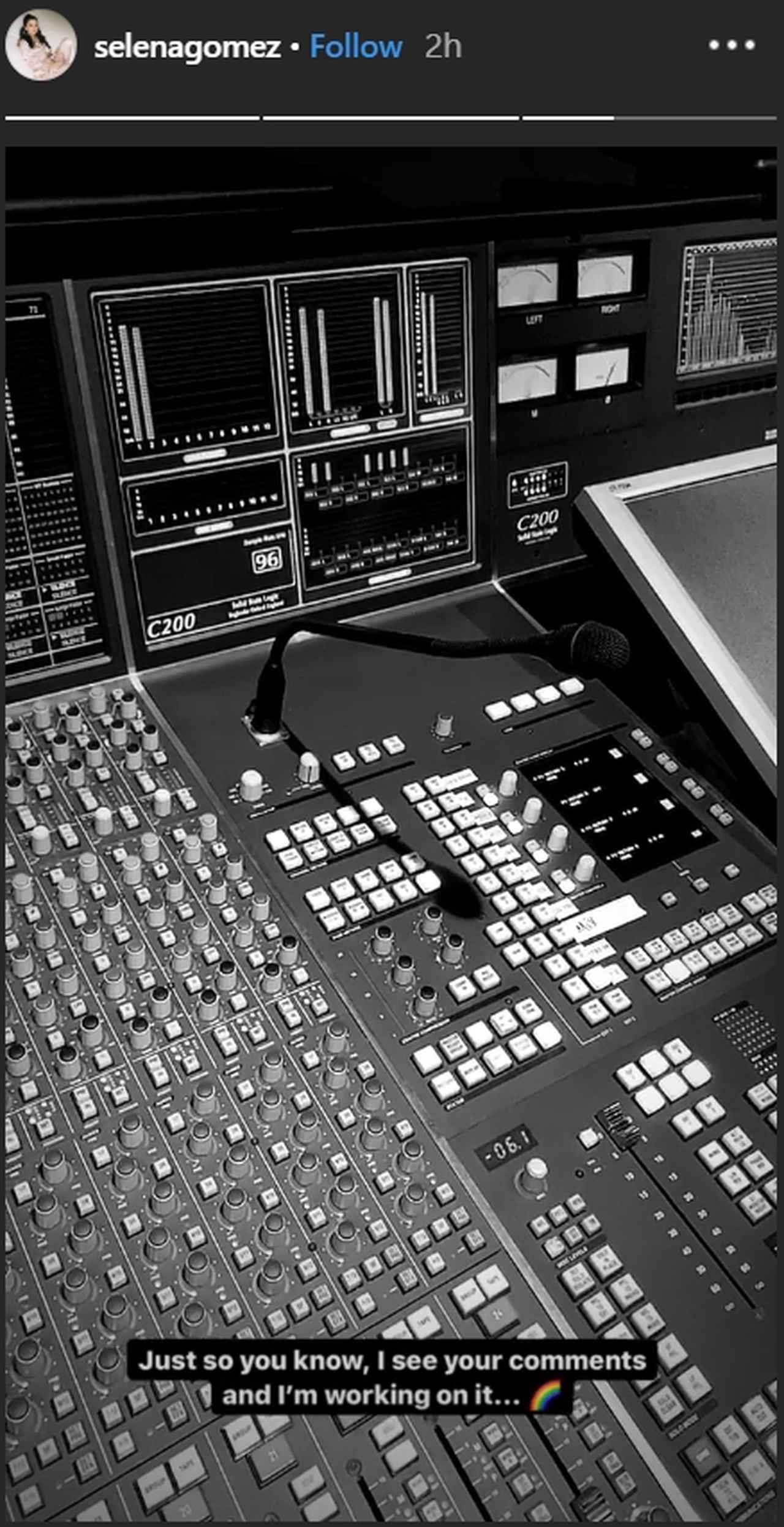 セレーナは、コントロールルームで撮影されたこの写真にキャプションを添えており、「一応言っておくと、みんなのコメントは読んでいるよ。いまそれに取り掛かっているからね」とコメント。なんらかのレコーディングをしていることは明らかだけれど、セレーナのSNSにはつねに新アルバムを熱望するファンからの声が多く寄せられていることから、セレーナが語る「それ」とは、アルバムについて話している可能性が高い。