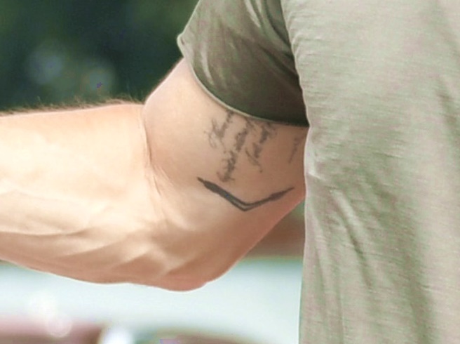 この日ブラッドは珍しく半袖姿で現れ、腕にあるタトゥーを披露。