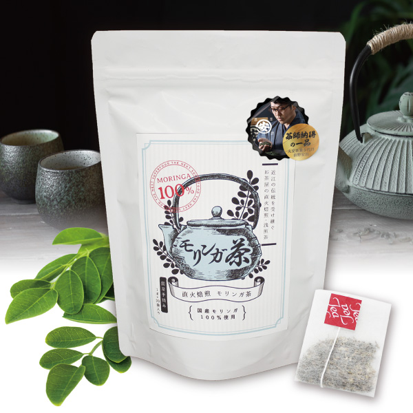 そんなモリンガが手軽にとれる「直火焙煎モリンガ茶」は、国産モリンガを100%使用。茶葉を焙煎するのは、創業明治5年の老舗で、145年の歴史を受け継ぐ茶師。モリンガの風味をしっかりと生かした直火・浅煎茶に仕上がっている。