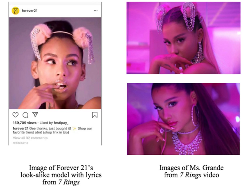 契約締結には至らなかったにも関わらず、フォーエバー21が、2019年の1月から2月にかけて、アリアナの写真や名前、「7リングス」歌詞の一部など合計で30以上の商標を無断でSNSでのキャンペーンに利用したと指摘し、証拠として同社の公式インスタグラムに投稿されたアリアナの写真や類似アイテムの写真のスクリーンショットを提示した。