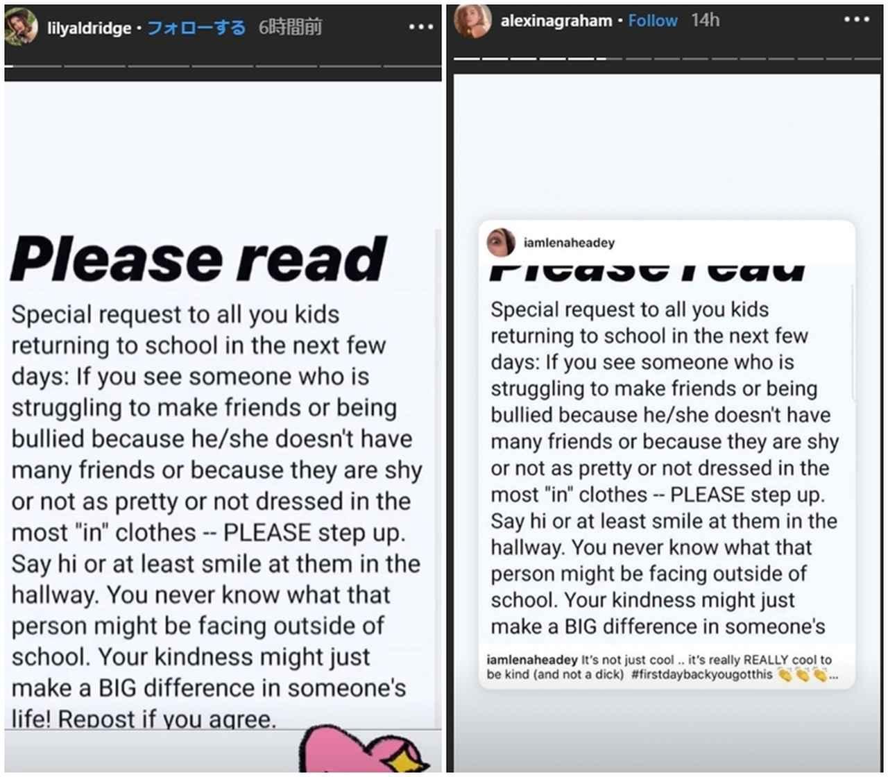 ツイッターやインスタグラムでシェアされている投稿に綴られているのは、学校に通う10代の子供たちへのメッセージ。ヴィクトリアズ・シークレットのエンジェルとして活躍するリリー・オルドリッジアレクシーナ・グラハムもインスタグラムでこのメッセージをリポストしており、そこにはこう書かれている。