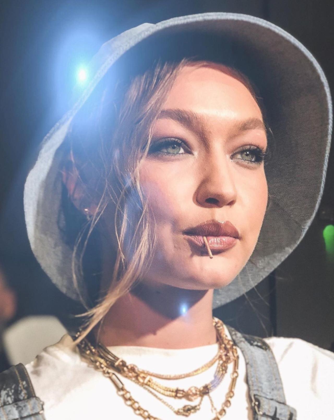 ジジはこの日、オーバーオールというカジュアルな姿でファッションショーに登場。しかし、口元を見てみると、そこにはなんと爪楊枝が。ジジは爪楊枝を口に咥えながらフォトコールに参加して、いつもとは変わったエッジの効いたやんちゃな姿を見せた。