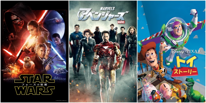「スター・ウォーズ/フォースの覚醒」© & TM Lucasfilm Ltd. All Rights、「アベンジャーズ」TM & © 2012 Marvel & Subs.Reserved.、「トイ・ストーリー」©2019 Disney/Pixar