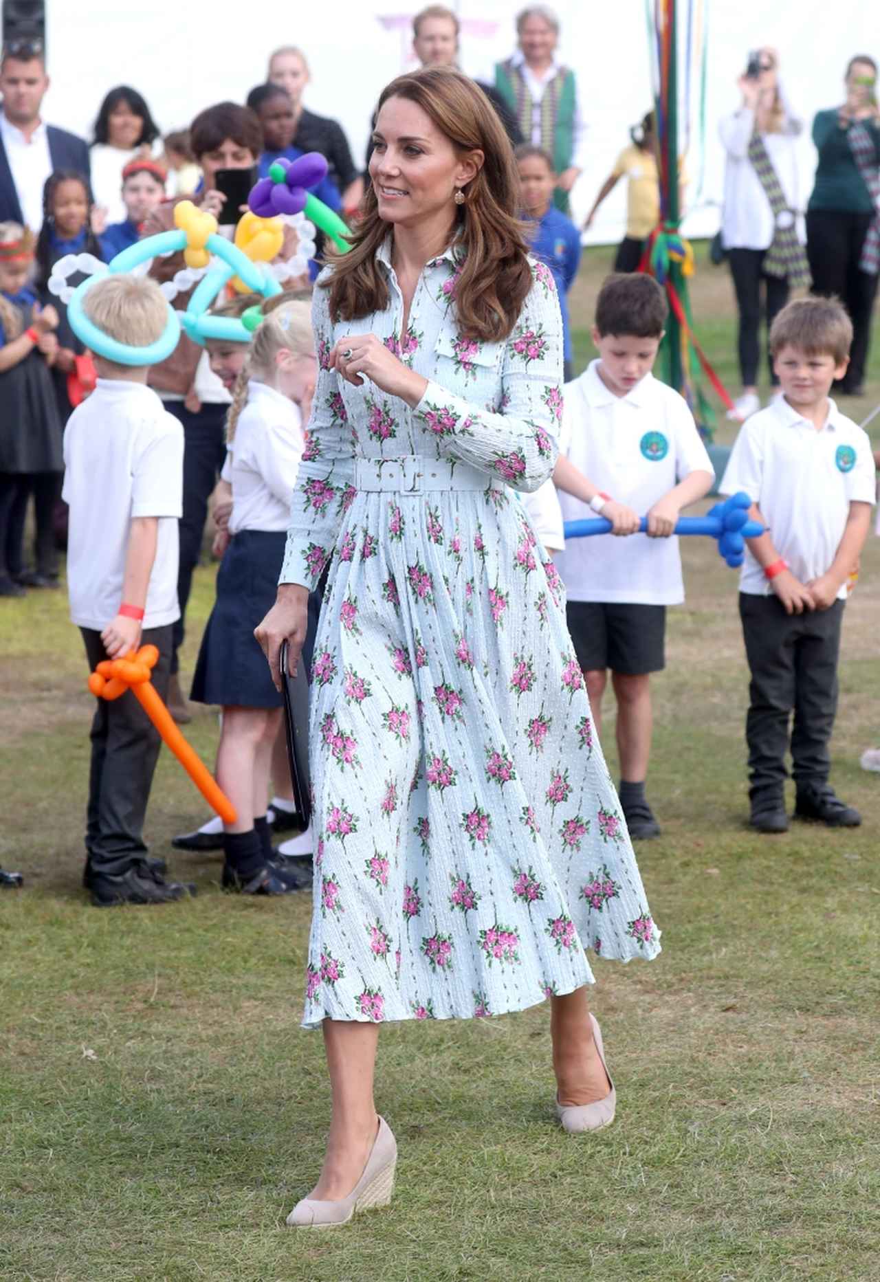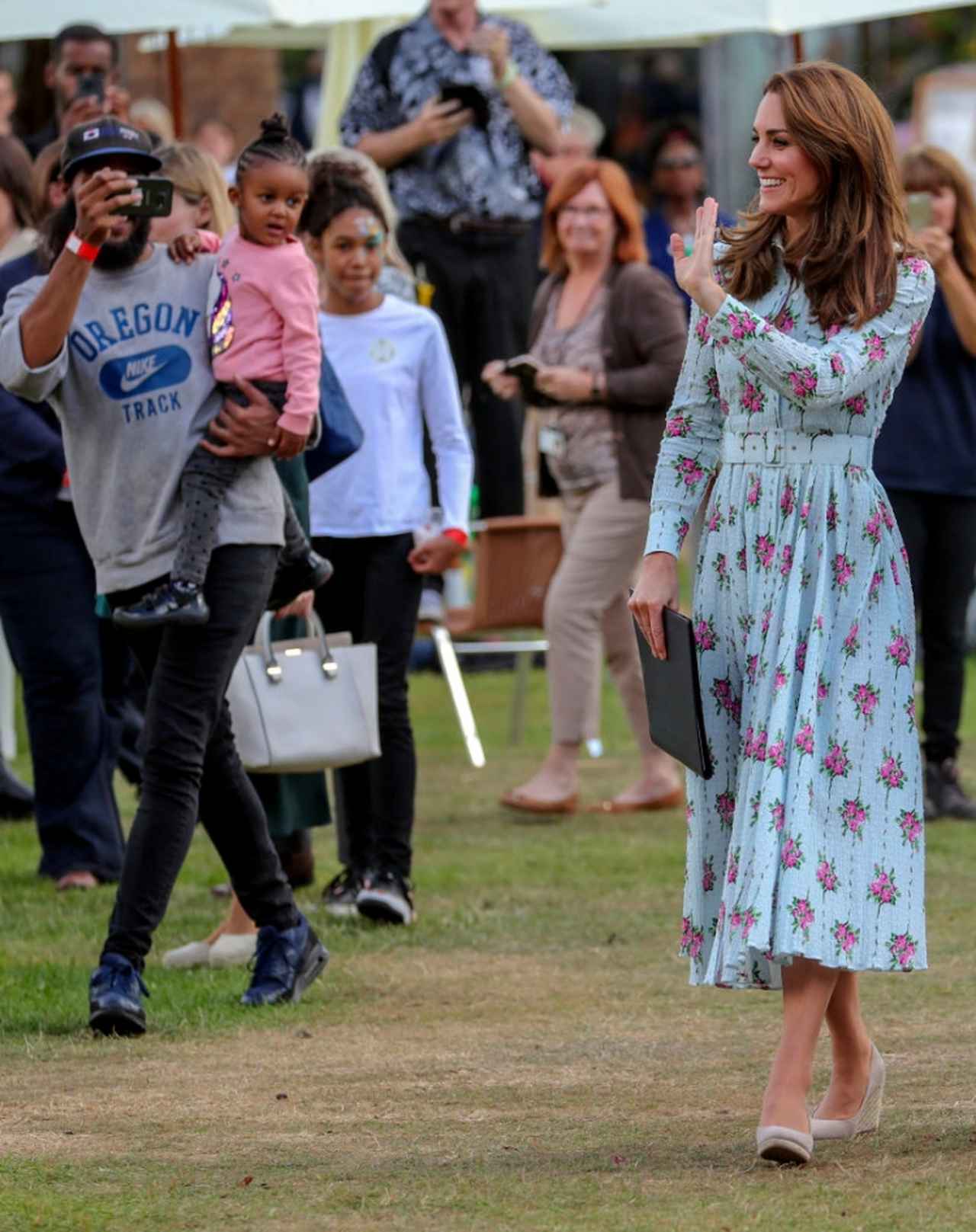 この日は、お気に入りブランドEmilia Wickstead(エミリア・ウィックステッド)のフローラル柄のシャツワンピに、ウェッジソールが嫌いなエリザベス女王が“いない時だけ”よく履いている、ハイストリートブランド、Monsoon(モンスーン)のベージュのウェッジソールパンプスを合わせた着こなしで、庭園内の草花にも負けない可憐な美しさで魅了した。