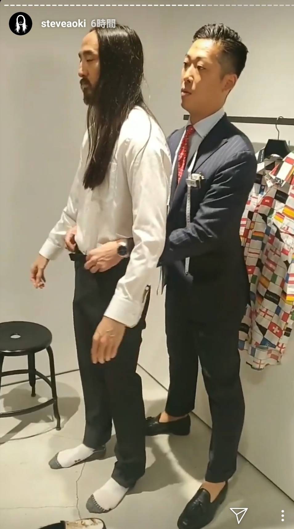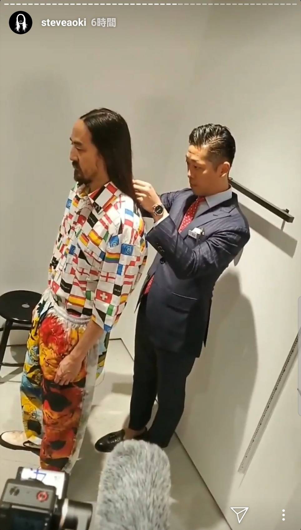 DJプレイ中の顔面ケーキでおなじみの人気DJ、スティーヴ・アオキが来日。日本で「スーツのアオキ」を訪問した。(フロントロウ編集部)