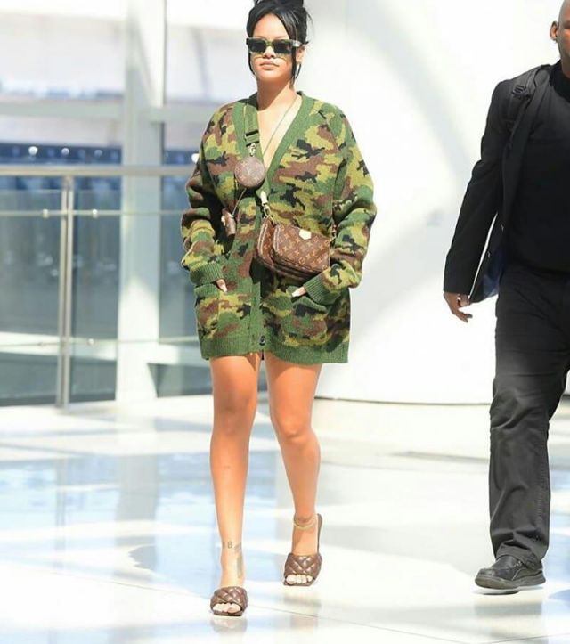 オーバーサイズのカモフラプリントのニットを1枚着して、ヒップにコーデしたトップシンガーのリアーナ。今年注目されているカモフラプリントは、簡単にミリタリーグリーンを取り入れられるオススメアイテム。Louis Vuittonのショルダーバッグをフロントでクロスボディにした、旬なスタイリングにも注目。
