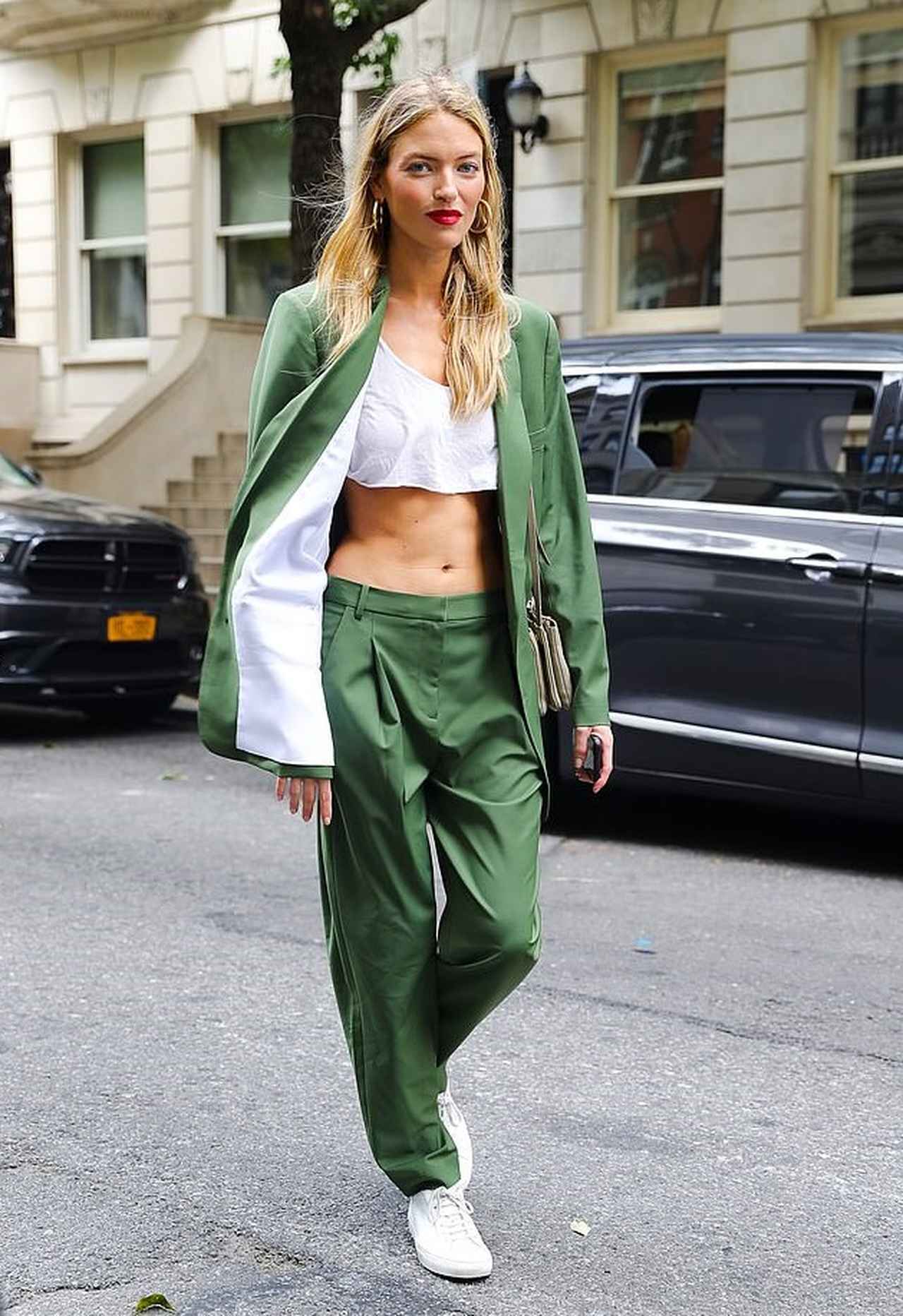 今季も注目のメンズライクなセットアップスーツを白スニーカーで着崩した、トップモデルのマーサ・ハント。ミリタリーグリーンでボーイッシュにまとめ、レッドリップで女らしさもプラス。スーツは Tibi 、スニーカーはCommon Projectsのもの。