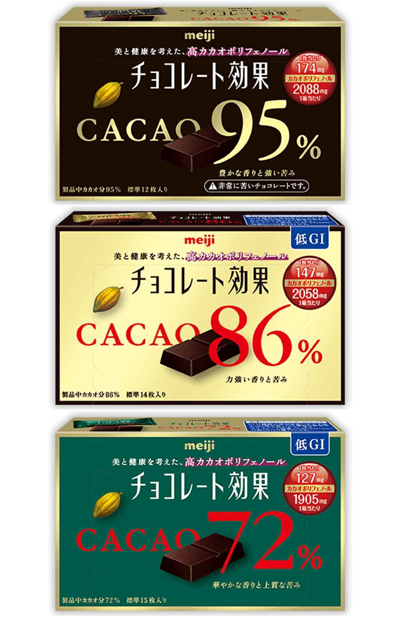 明治が販売する高カカオチョコレート「チョコレート効果」は、72%、86%、95%とカカオの含有パーセンテージが選べるうえ、健康への働きが期待され、高い抗酸化作用で知られる「カカオポリフェノール」がたっぷり。1枚あたりカカオポリフェノールが127mg~174mgも含まれているので、チョコレートを食べながら、ポリフェノールが気軽に摂取できる。