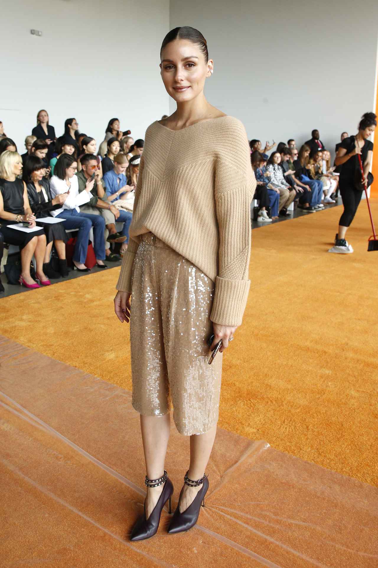 ベージュのさっくりした大きめニットに、ベージュのスパンコールが輝くショーツを合わせた人気ファッショニスタのオリヴィア・パレルモ。