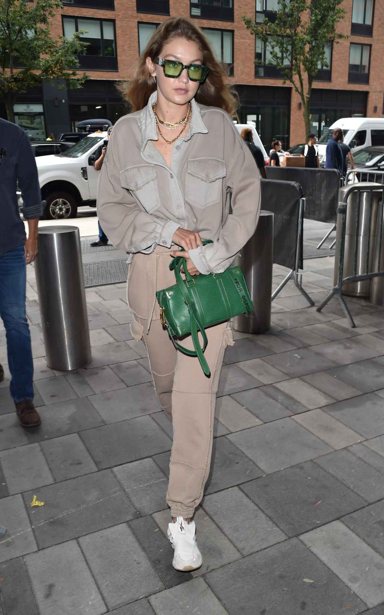 カジュアルなベージュのスウェット素材のトップス+パンツのリラックスコーデに、バッグで鮮やかなグリーンを差し色したトップモデルのジジ・ハディッド。「ベージュ×グリーン」はオシャレ見えする色の掛け合せ!