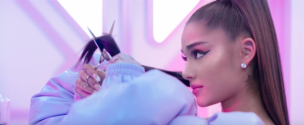 さらに、終盤には、「新しい香水にはアリアナのポニーテールの一部が入ってるらしいよ」というとんでもないウワサに呼応するように、アリアナがハサミを使って自らポニーテールをちょっとずつカットするシーンも。