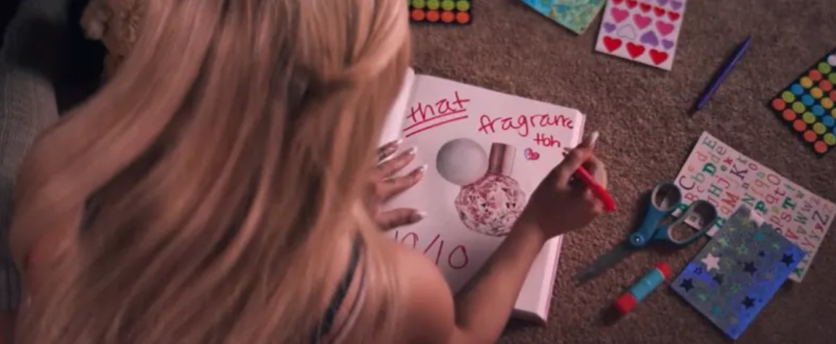 本編に登場した映画『ミーン・ガールズ』発の“バーン・ブック”もお目見えし、アリアナが過去にリリースした香水について「10点満点」、「ほかの女子たちを震え上がらせた」といった評価を書き入れる場面も登場する。
