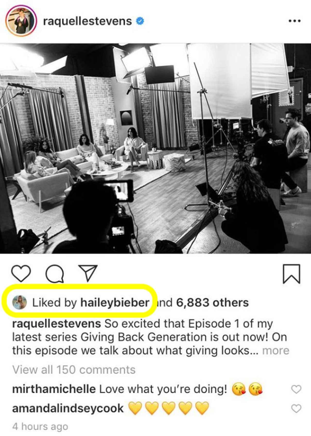 彼女たちのボッドキャストを紹介するラケルのインスタグラムの投稿には、1万件を超える「いいね」が集まったが、その中には、ヘイリーからの賛同も含まれていた。