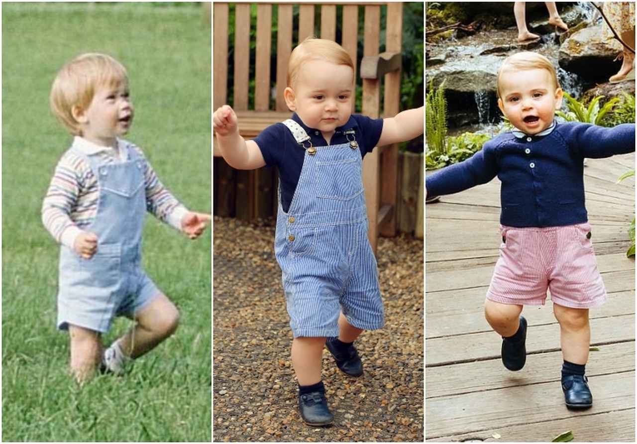 左から:幼少期のヘンリー王子、1歳頃のジョージ王子、今年5月に撮影されたルイ王子の写真。ルイ王子はジョージ王子のお下がりのオーバーオールの上にカーディガンを重ね着。