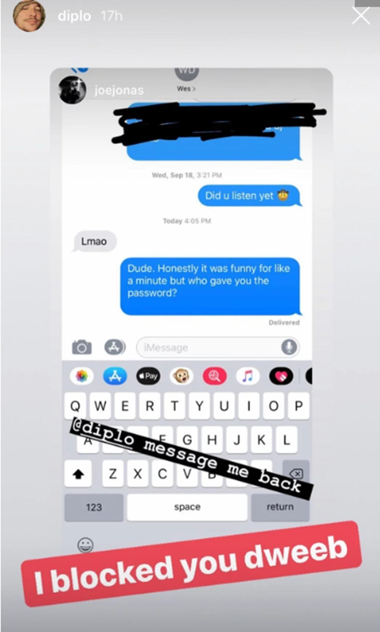 こうした経緯でジョーとちょっとした因縁関係にあるディプロが、今回はジョナス・ブラザーズのインスタグラムを乗っ取り。誰かがディプロにジョナス・ブラザーズのインスタグラムのパスワードを教えると、ディプロはアカウントのアイコンを自分の写真に変え、その後自身の写真やジョナス・ブラザーズをからかう写真などを連投。