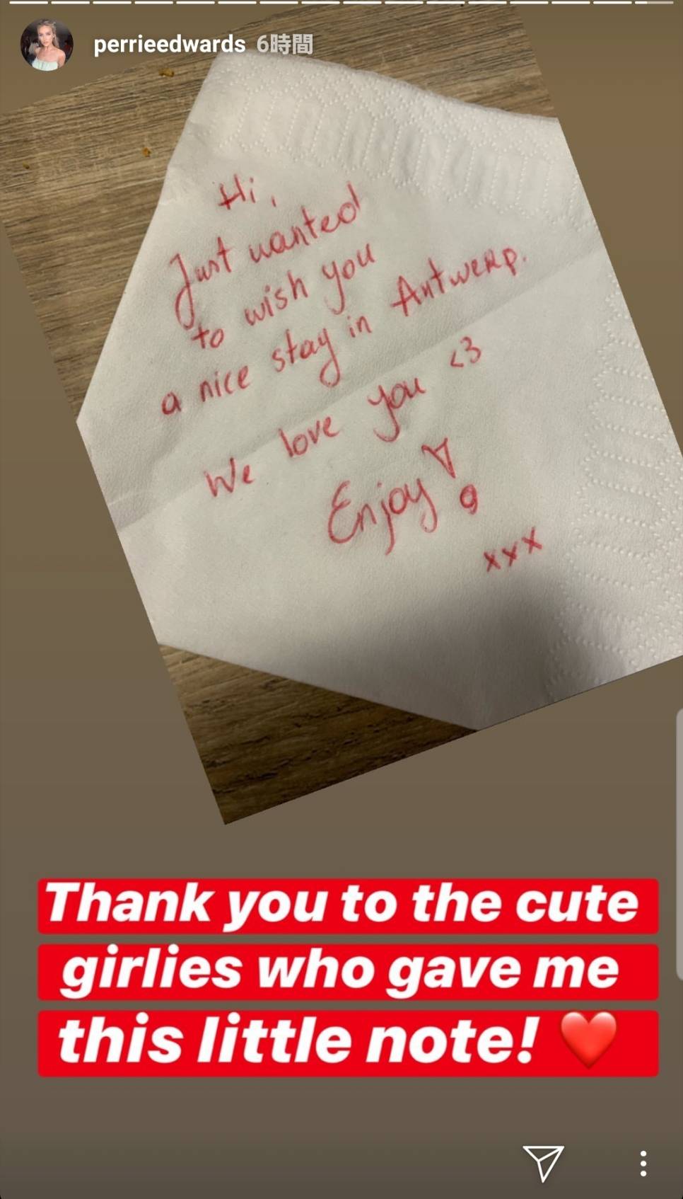 この日はプライベートにもかかわらず、ペリーはレストランで1人ずつ丁寧にファンサービスをして神対応。ペリーの優しすぎる対応には思わず泣き出してしまうファンも。こうして快くファンサービスをしたペリーは、あるファンからレストランに置いてある紙ナプキンをもらった。その紙ナプキンには「ハイ、アントワープでは素敵な滞在になることを願っています。私たちはあなたのことを愛しています。楽しんで!」と書かれていた。