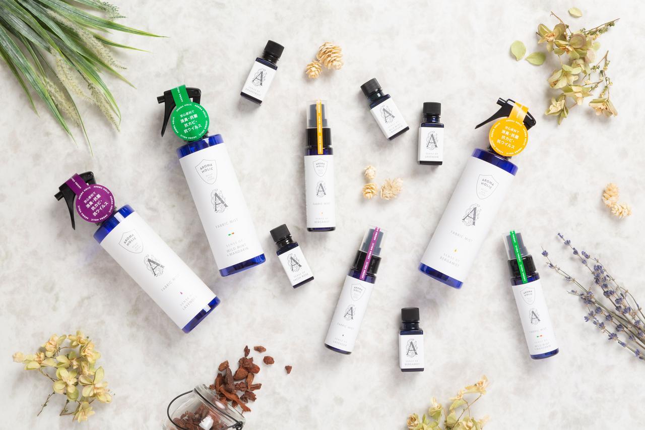 純水(脱イオン水)に水溶性アロマオイル「アロマホリック」をブレンドしたファブリックミスト「ファブリックミスト ワイルドミント&マンダリン」も登場。カーペットやソファ、カーテン、枕、衣類、靴箱など、様々なアイテムに使用可能で、非常に高い、抗ウイルス・抗カビ・抗菌機能が証明されている 。