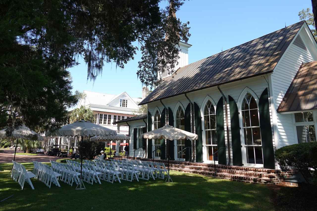 ジャスティンとヘイリーが約1年越しの結婚式の会場として選んだのは、米サウスカロライナ州ブラフトンにある、緑に囲まれたラグジュアリー・リゾートホテル「モンタージュ パルメット・ブラフ(Montage Palmetto Bluff)」に隣接するチャペル。