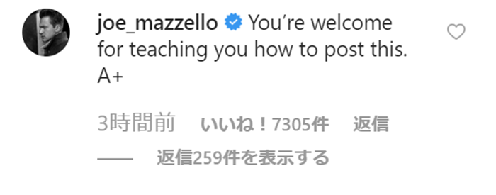 そこでジョーは、この投稿にまつわる裏話を暴露。どうやらラミは、この投稿をするにあたりインスタグラムの投稿の仕方をジョーから教わっていたようで、ジョーはコメント欄に「この投稿の仕方を教えてあげたことにどういたしまして。A+」と書き込み、ラミの投稿に大変よくできましたと言わんばかりのA+評価をした。