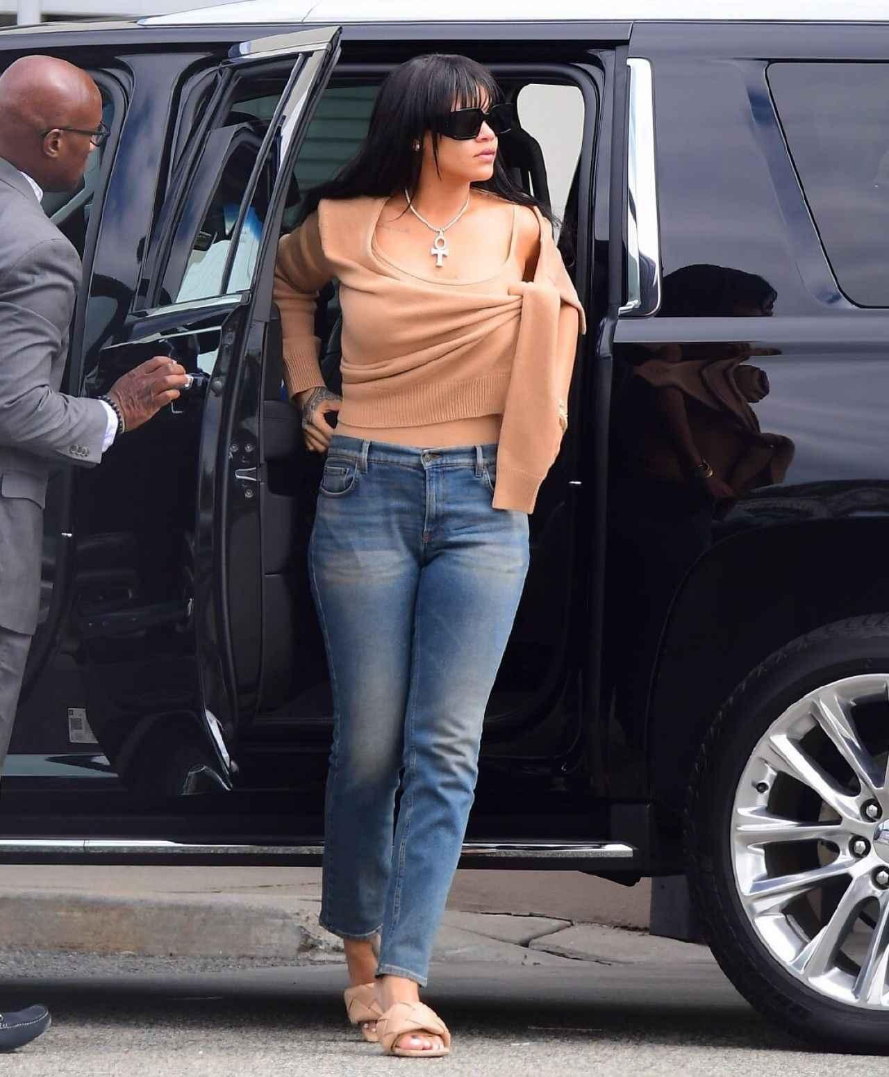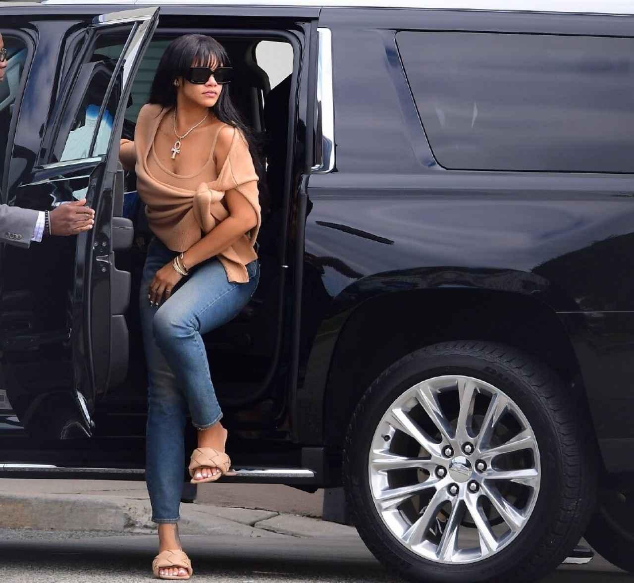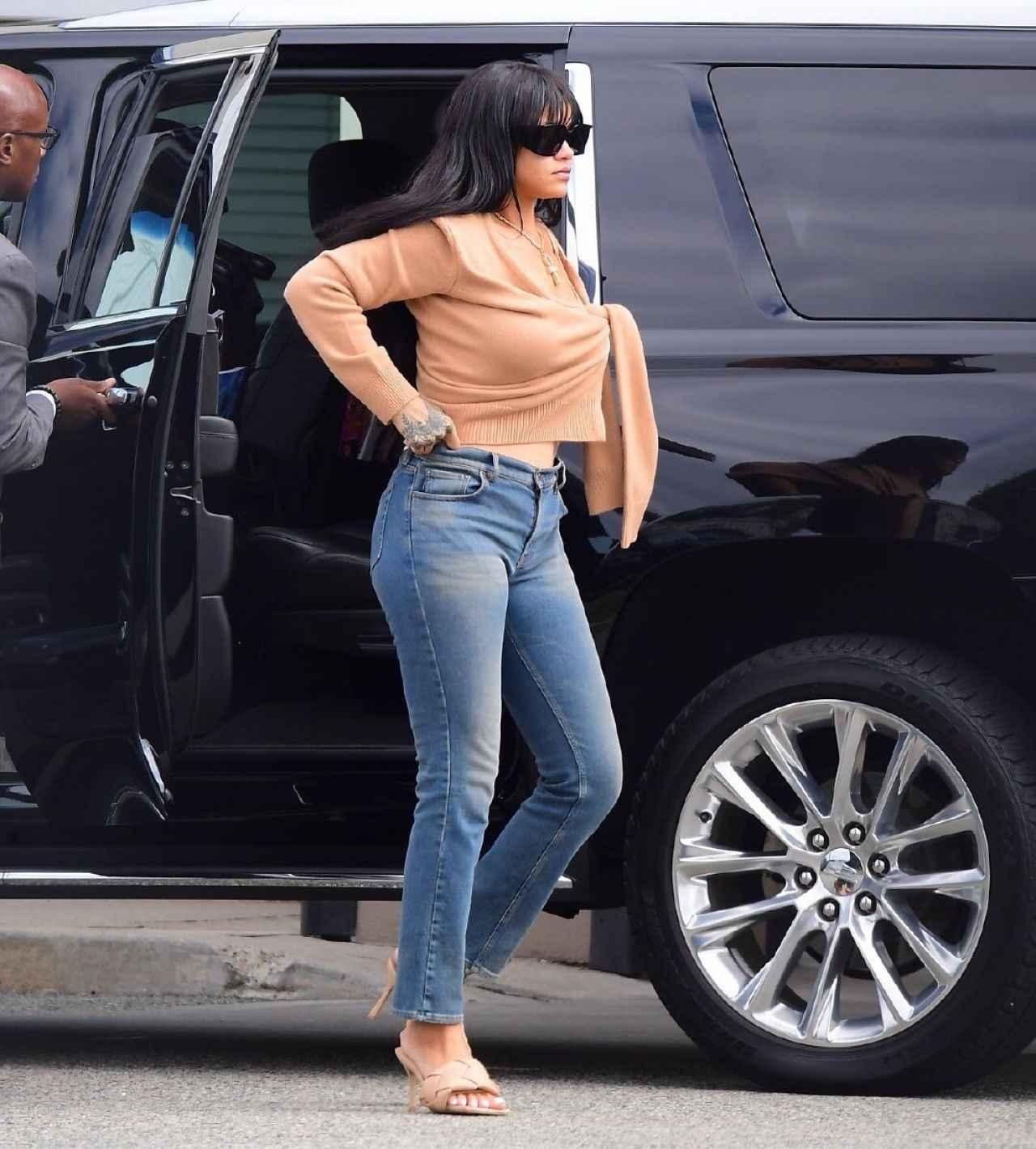 マイケル・コース コレクションのベージュニットは、高品質なカシミアでできており、なめらかな肌触りのため、リアーナのように素肌でさらりと着用できる贅沢なアイテム。あえてダメージ加工のデニムにラフに合わせてこなれてみせて。