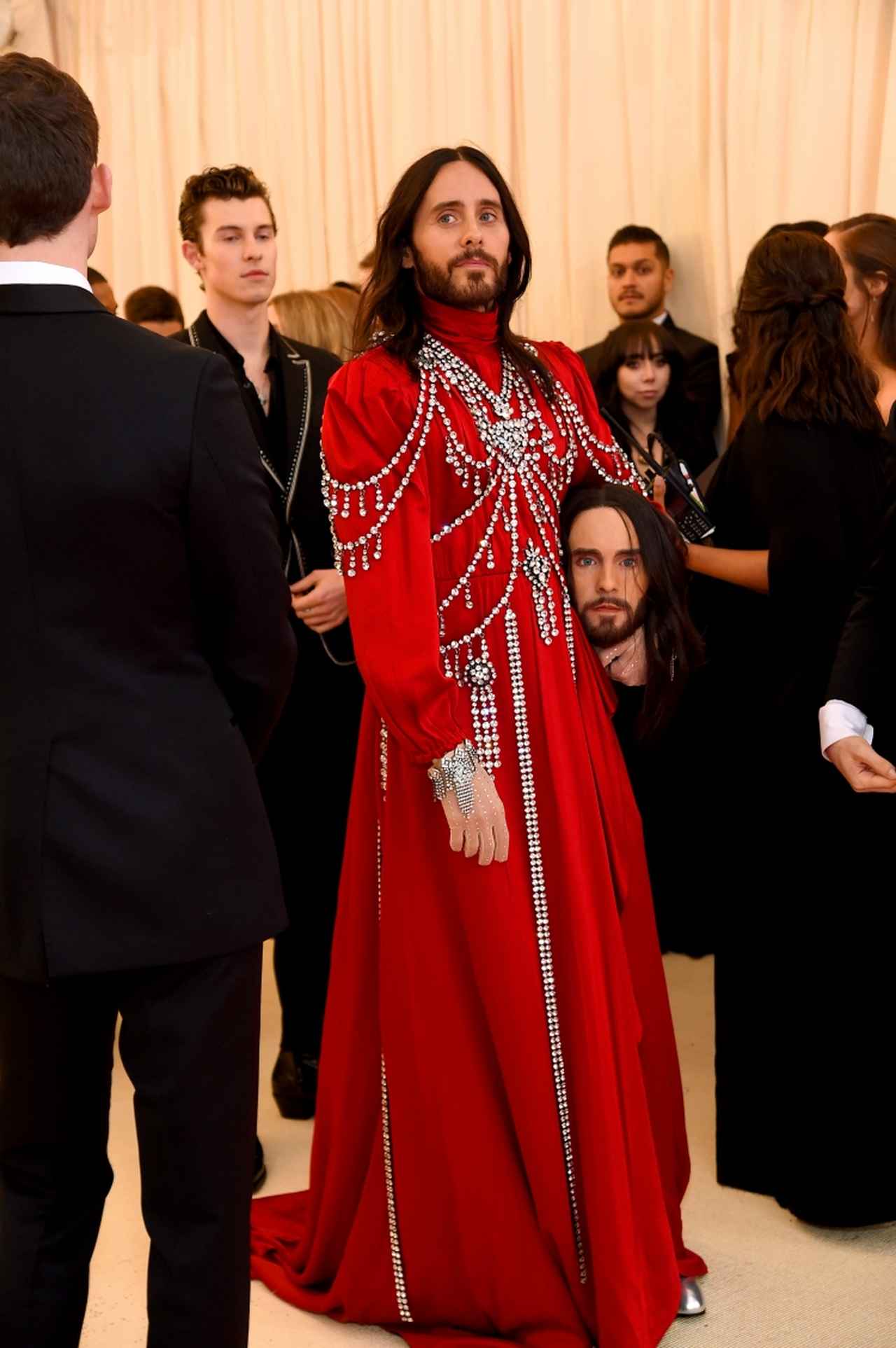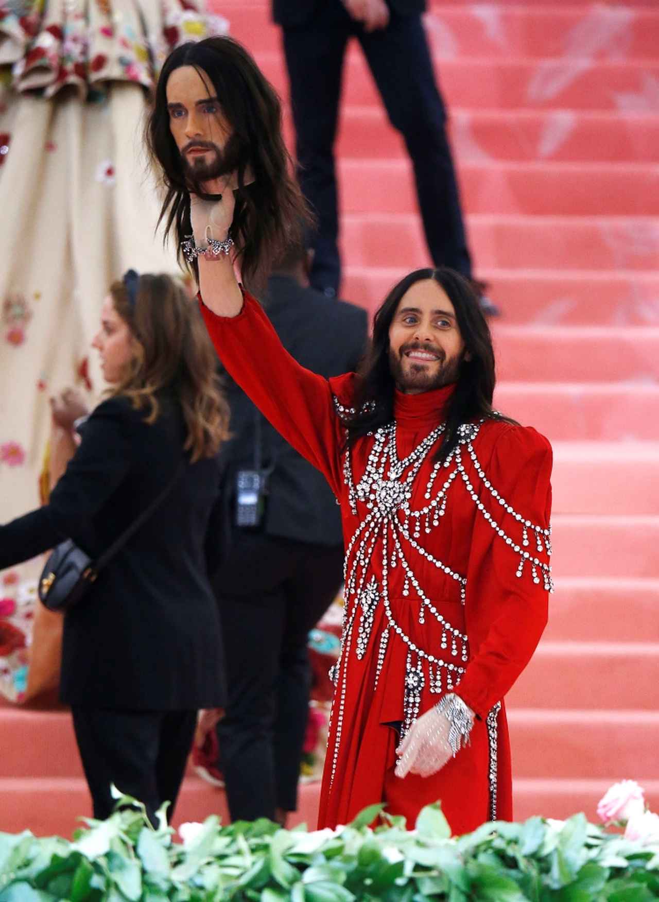 もともとは、人気ファッションブランド、グッチ(Gucci)の2018年秋冬コレクションのランウェイにアクセサリーの一種として登場したものを、ジャレッドが“自分仕様”にして取り入れたこの「生首」は、METガラのレッドカーペットだけでなく、アフターパーティーでも大人気に。一緒に記念撮影をしたがるセレブが続出した。