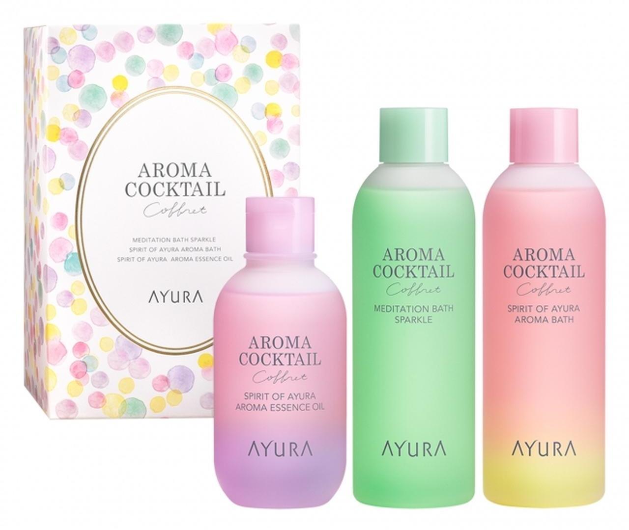 「アユーラ アロマカクテルコフレ」は、入浴料2種とヘア&ボディ用オイルがセットになったバス&ボディケアコフレ。