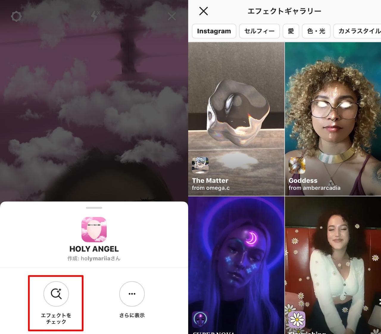 その結果、インスタグラムユーザーならご存知の通り、ストーリー機能を開くと、様々なフィルターが使えるように。インスタグラム上に公開されるすべてのフィルターは、フィルターの名前の部分をタッチすると出てくる「エフェクトをチェック」というアイコンから見ることが出来る。