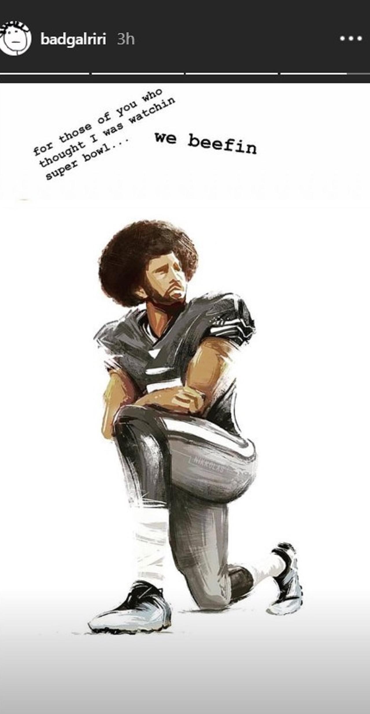 さらに、この行動を彼女が「スーパーボウルを見たがっている」と勘違いしたフォロワーたちに向けて、キャパニック選手のひざつき姿を描いたイラストに「私がスーパーボウルを観てると思った人たちへ…」、「私たち(自分とNFL)は不仲」というコメントを添えて、自分自身の立ち位置を明確にしていた。