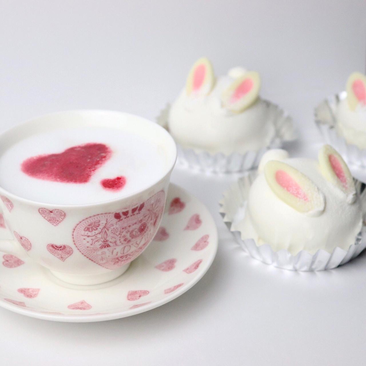 甘酸っぱいフランボワーズパウダーで飾ったハートのカフェラテと、ほのかに香りチーズのウサギブッセが登場。