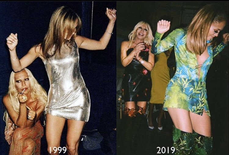 右側にシンガーで女優のジェニファー・ロペスが写り、左奥にデザイナーのドナテラ・ヴェルサーチェが写る写真。なんとこの1枚が、1999年に撮影された2人が写ったものと非常に似ているのだ。