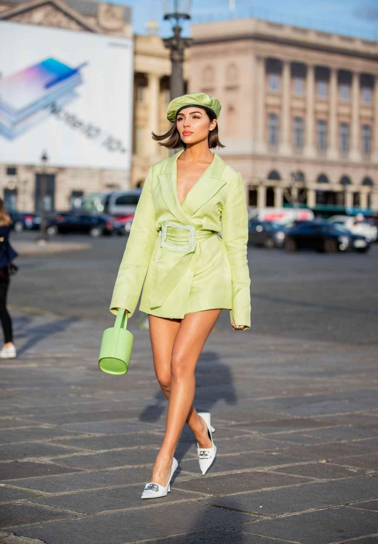 人気モデルのオリヴィア・カルポは、ジャケットワンピをメインに全身ライトグリーンで統一した上級者なスタイル。オリヴィアもオーバーサイズのジャケットワンピを選び、ベルトでウエストマークして、しっかりメリハリをつけて女らしさもプラスして。