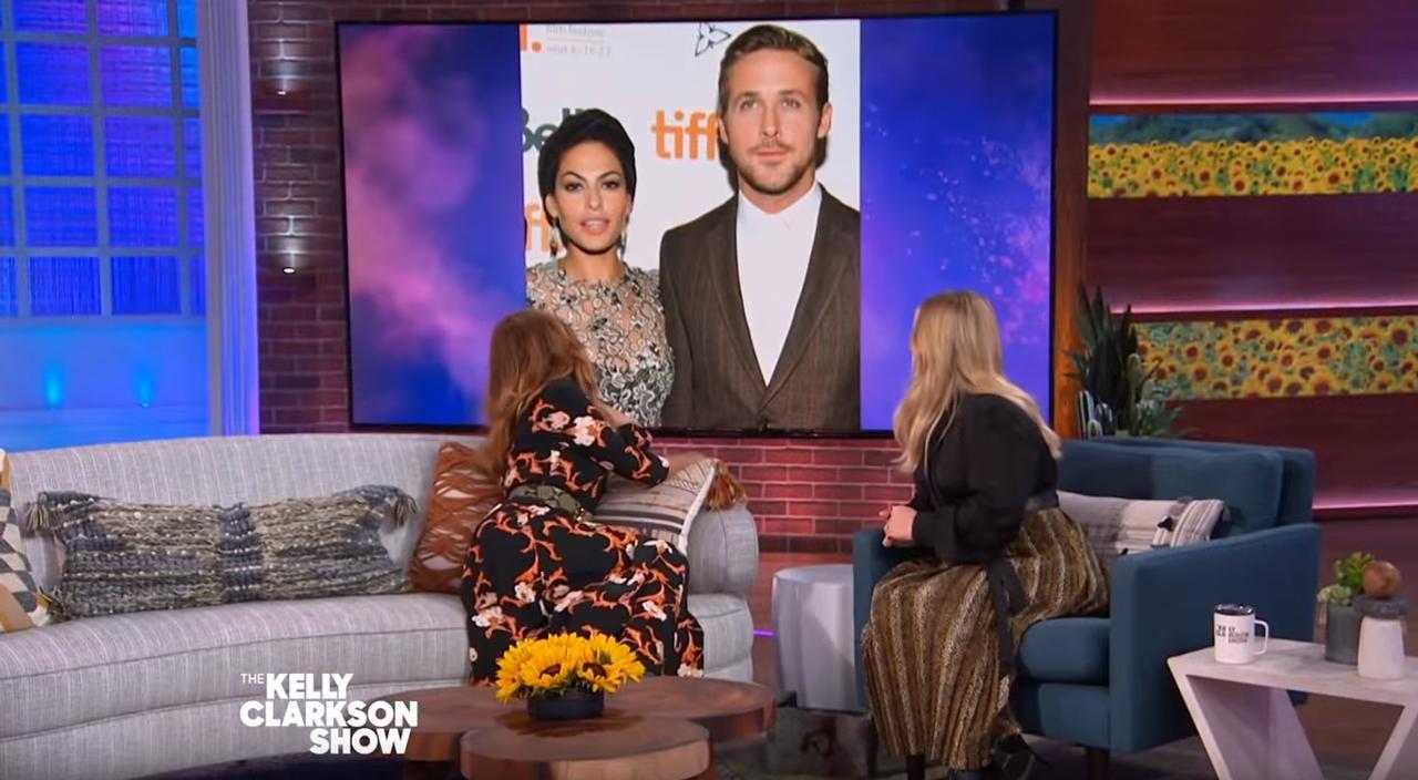 米トーク番組『The Kelly Clarkson Show(原題)』に出演したエヴァ。司会者のケリー・クラークソンとエヴァがママトークを繰り広げていると、後ろの画面にエヴァとライアンが共演した映画『プレイス・ビヨンド・ザ・パインズ/宿命』のプレミアの写真が。