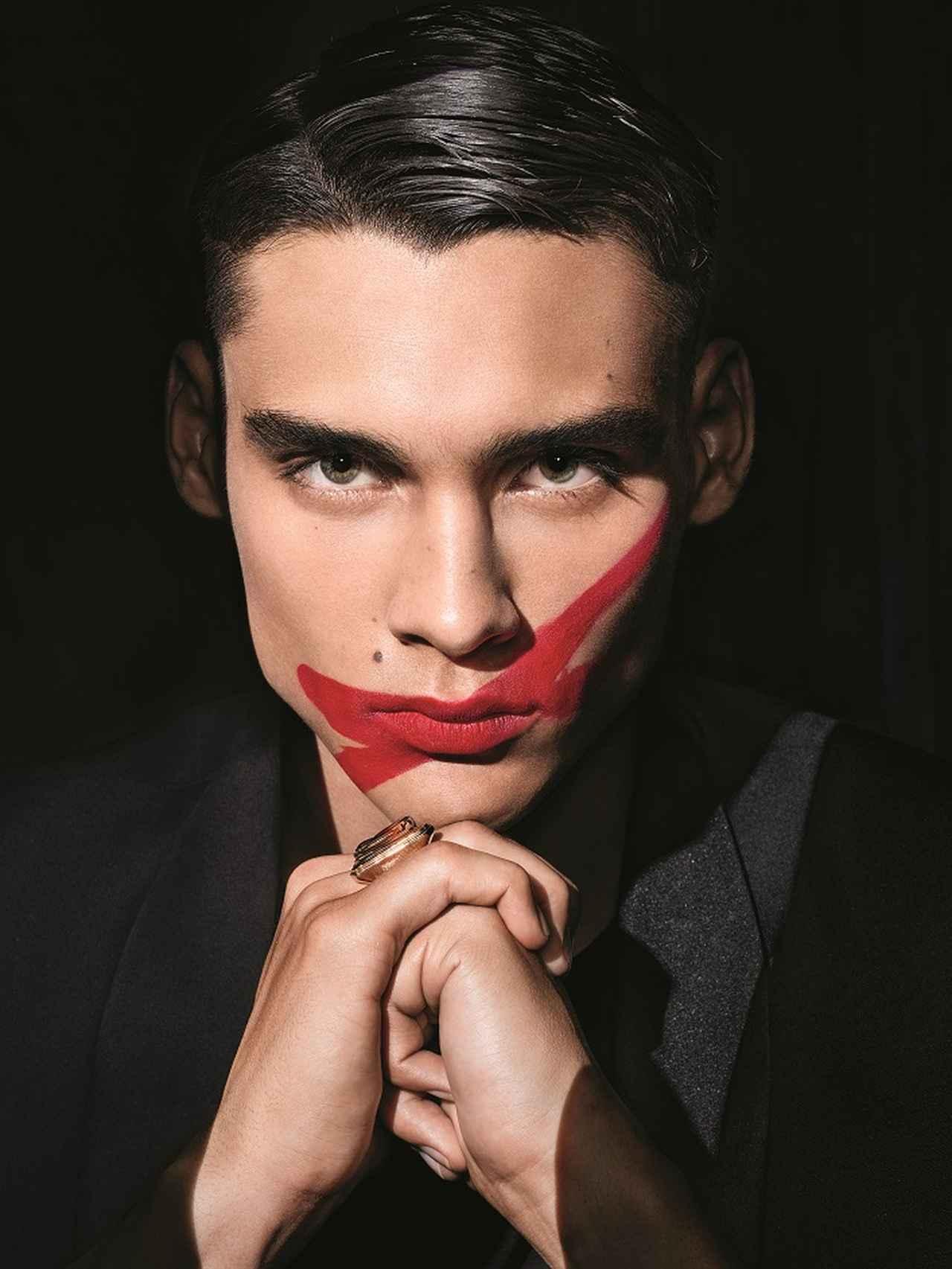 妖しく不気味な笑みをたたえる男性は、モデルのルートヴィヒ・ヴィルスドルフ。彼もまたルージュ ディオールを纏い、従順な表情から不穏な表情まで、見たことのないルージュ ディオールの新たな一面を表現した。