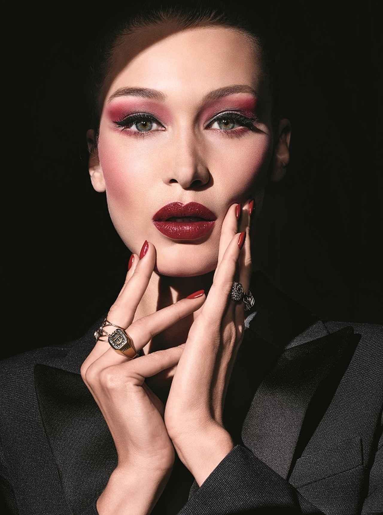 ヒッチコック映画のような張り詰めた一幕を撮影したのは、巨匠リチャード・バーブリッジ。炎のように赤く染まった唇と、優美に伸びるアイライナーが際立つきらめく目元に、ベルベットのようなチークを纏ったベラ・ハディッドが、息をのむサスペンス短編映画に登場するような魅惑の女へと変貌する。