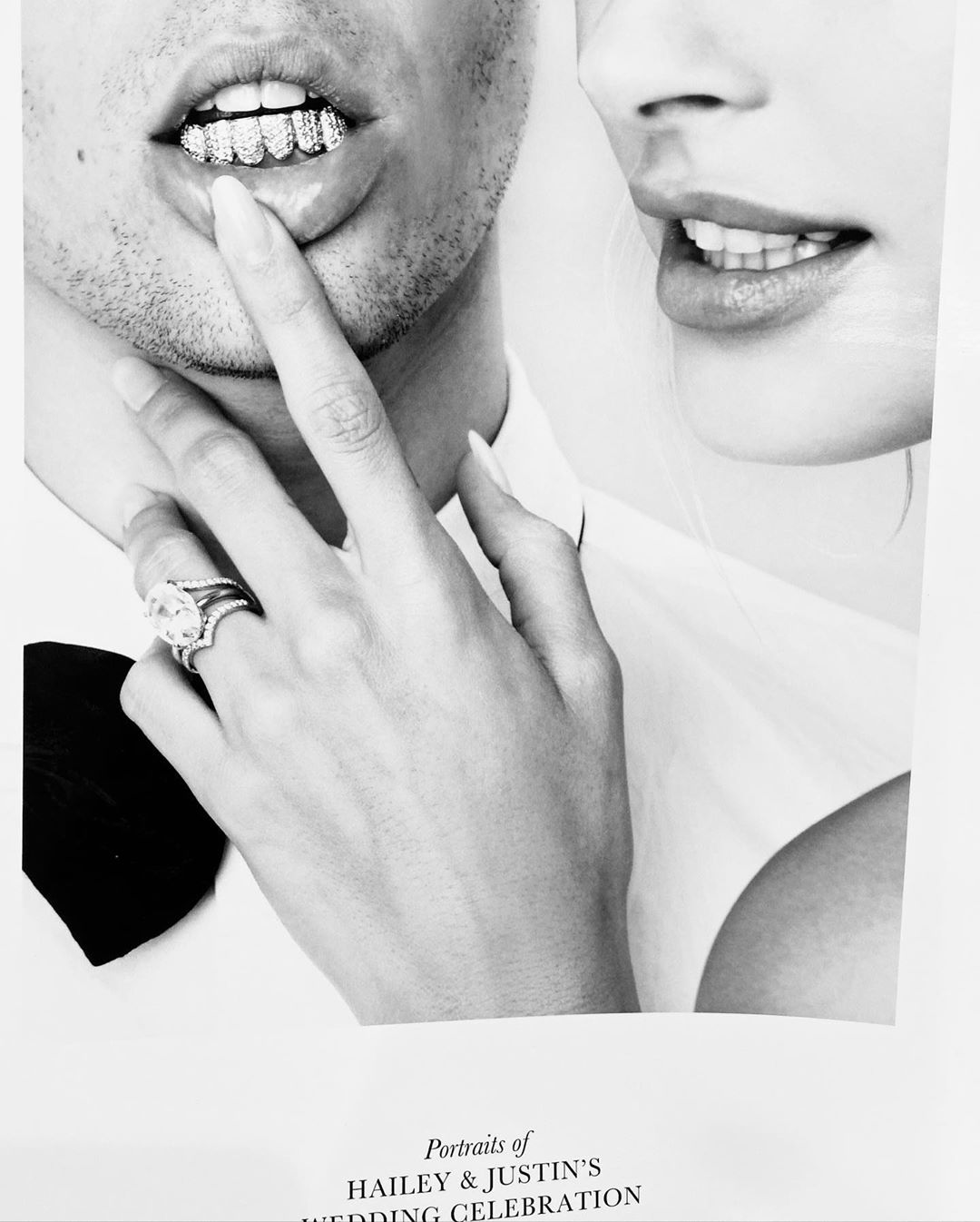 ビーバー夫妻がチョイスしたのは、一部のファンから不評を買っているグリル(※)を歯に装着したジャスティンと、ヘイリーの口元だけを写したアーティスティックなツーショット写真。ジャスティンの唇に添えられたヘイリーの左手の薬指に輝く、婚約指輪&結婚指輪がポイントとなっている1枚だ。