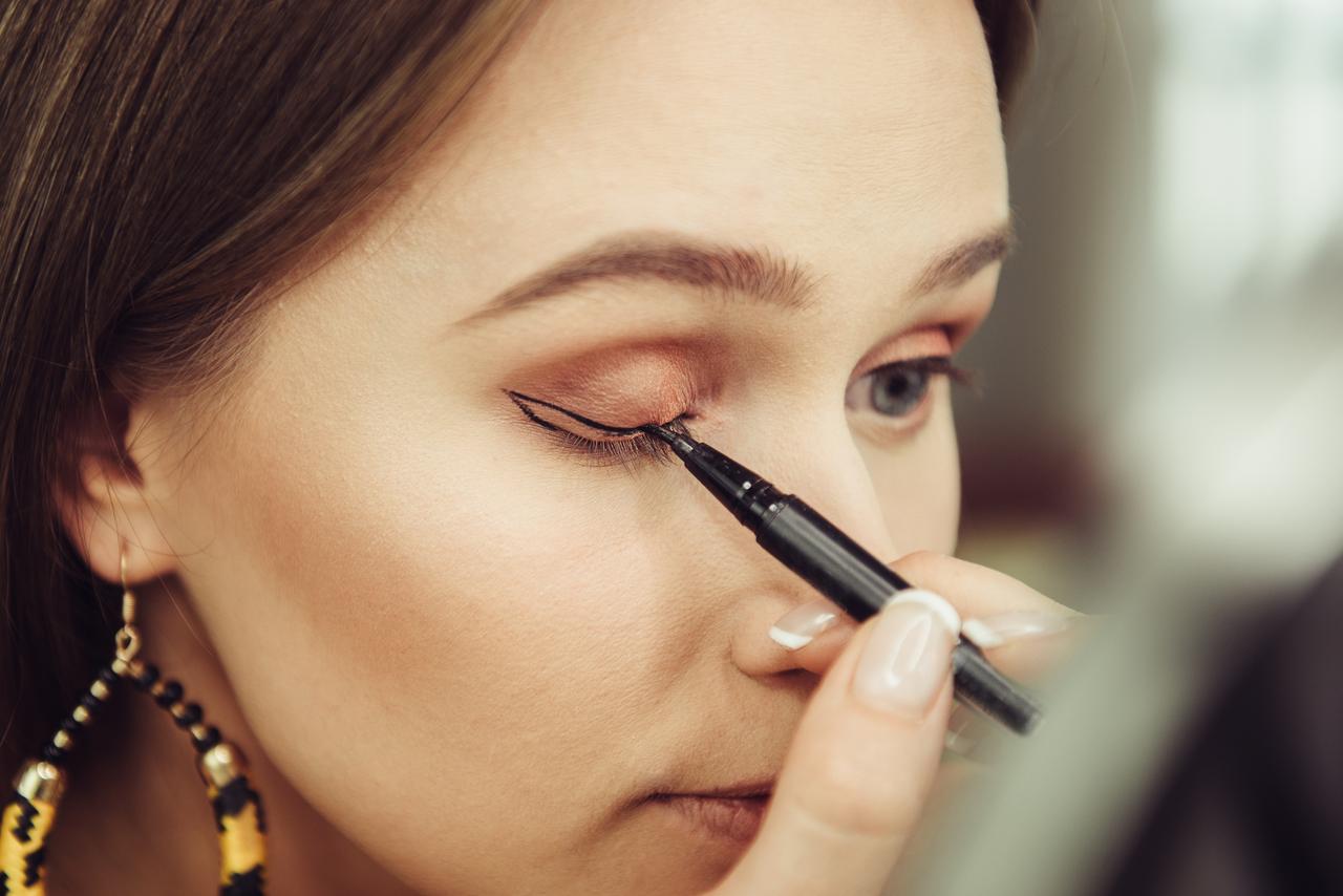 はじめに、目をリラックスした状態でスタート。目尻から上に向かってスッとアイラインを引く。どのくらいドラマチックに仕上げたいかによって好みの長さに調整する。