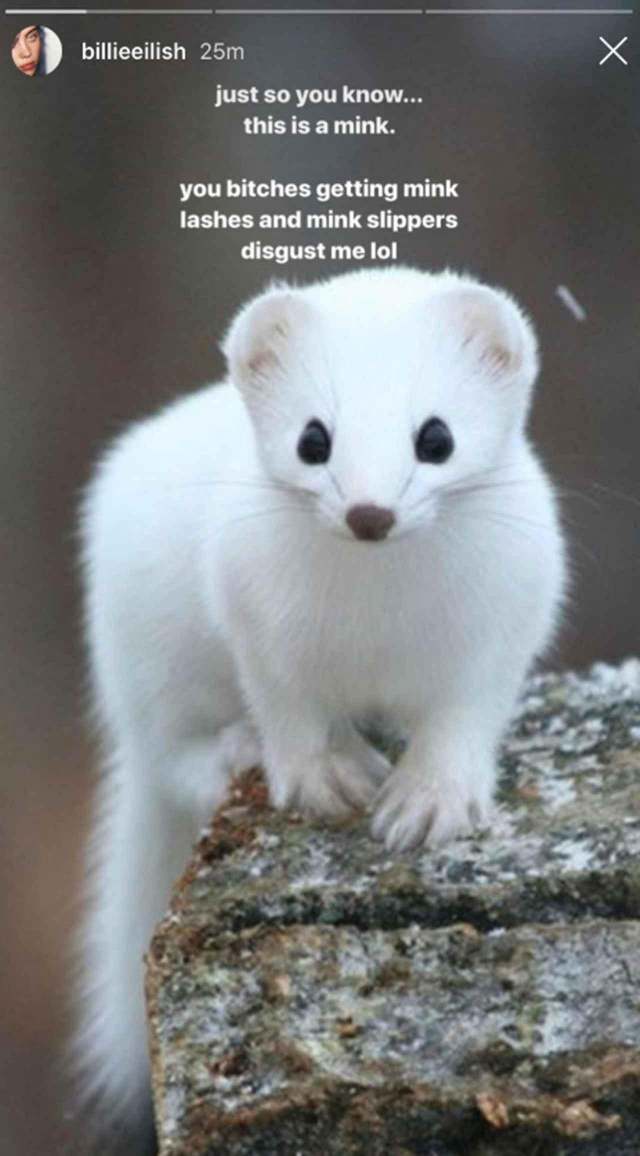 ビリーはミンクの写真に「ただ知って欲しいだけなの…。これがミンクよ。あんたたちが使ってるミンクで出来たまつ毛やスリッパにうんざりするわ(笑)」や「心はどこに行ってしまったの?」と、ミンクの毛を使っている人に向けた厳しい言葉を添えてSNSにアップした。