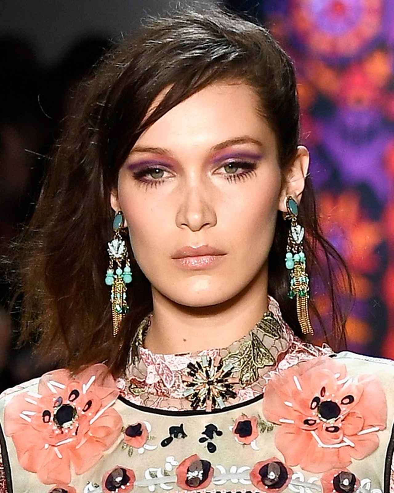 モデルのベラ・ハディッドは、愛らしくてスウィートなパープル×ピンクのメイクを披露。注目のフローティング・アイラインは、あえてぼかすことでフェミニンな雰囲気に。下まつげにマスカラをたっぷり塗って、ツイッギー風にするのもアリ。